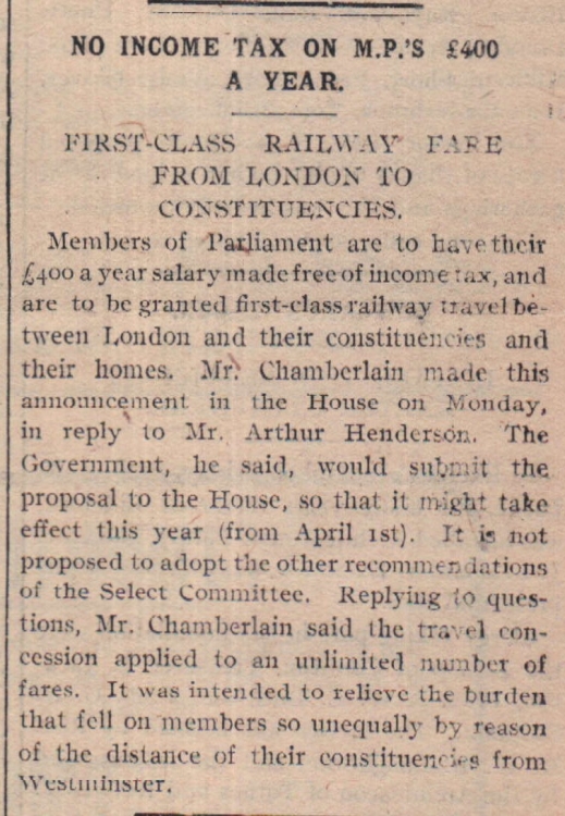 Members of Parliament will not pay income tax on their £400 a year salary and are to be granted first-class railway travel between London and their constituencies and their homes.