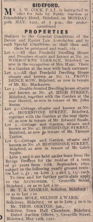 Property for sale – 30 Wimbourne Terrace; 11 Providence Row; 48 High Street; 46, 47 and 48 Honestone Street; and three shops with dwelling houses in Allhalland Street (owned by Mrs Short and Mr Rice).