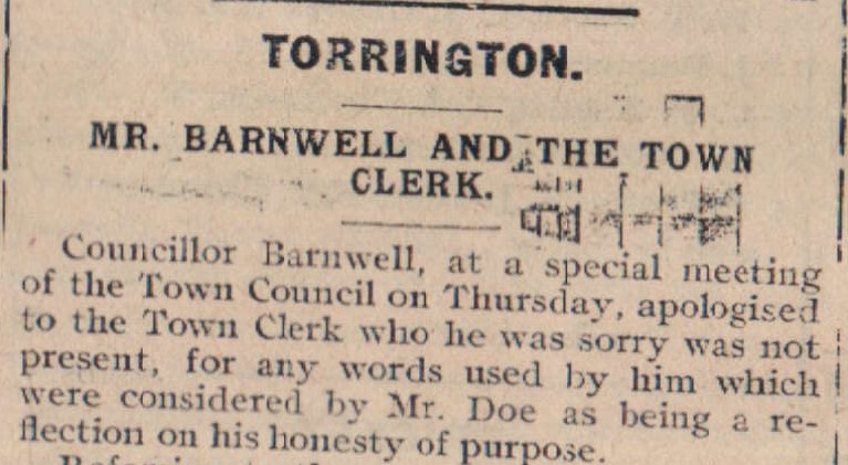 At the monthly meeting of the Torrington Town Council, the Town Clerk demanded an apology from Councillor Barnwell in respect of a statement made by him at a previous meeting. Mr Barnwell said that not for one moment did he dispute the honesty of the Town Clerk but the line of action he took was a protest at the way in which an account was passed around the table to be initialled.