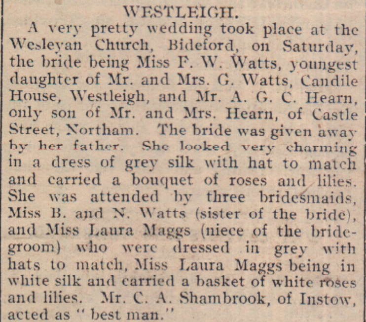 A very pretty wedding took place at the Wesleyan Church, Bideford, the bride being Miss F W Watts, youngest daughter of Mr and Mrs G Watts, Candile House, Westleigh. The groom was Mr A G C Hearn, only son of Mr and Mrs Hearn, of Castle Street, Northam.