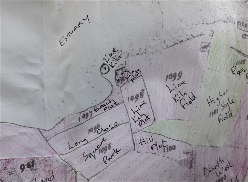 - Fig 10. 3 Fields with Limekiln in the name below the Rope Path at Appledore together with features showing a Lime Kiln