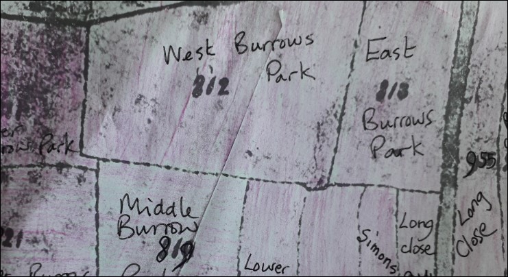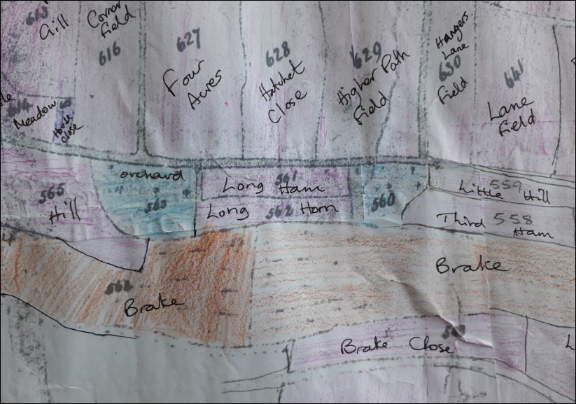 The above section is from the Northam Map. All the fields are numbered. The roads are marked by shading. Using just the map we can check the field sizes and position and locate the roads and houses. Unfortunately the roads are not named.
