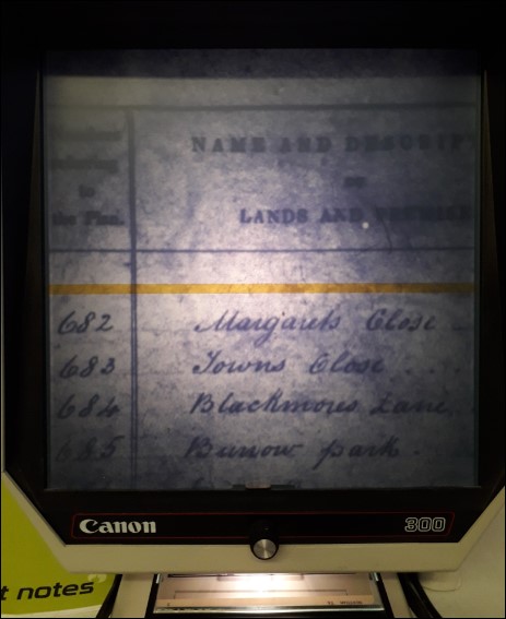 - Fig 2. A microfiche slide held in the Archive's collection which is a photograph of the original Apportionment book.The screen on this kind of viewer only shows a small section of each page d there are 6 pages per slide. This page shows field numbers and field names
