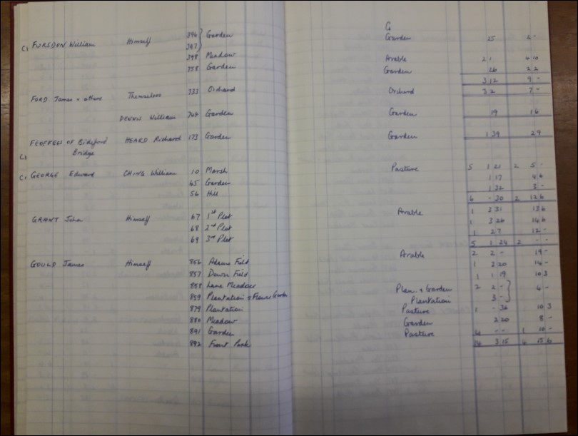 - Fig 3. A photograph of a book held in the Archive's collection which is a complete transcription of the microfiches of the local book. It shows the owner, the occupier, the field number, the field name, land use and area and payment due
