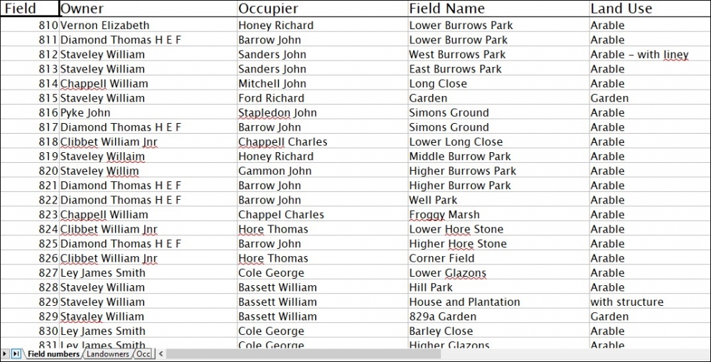 The modern searchable spreadsheet produced by a current volunteer at the Archive Fig 4 now means that the field can be found in moments. The field number will lead us to the name of the land owner, the occupier the field name and how the land was used.