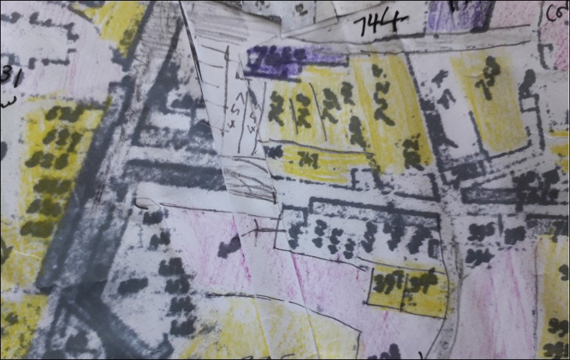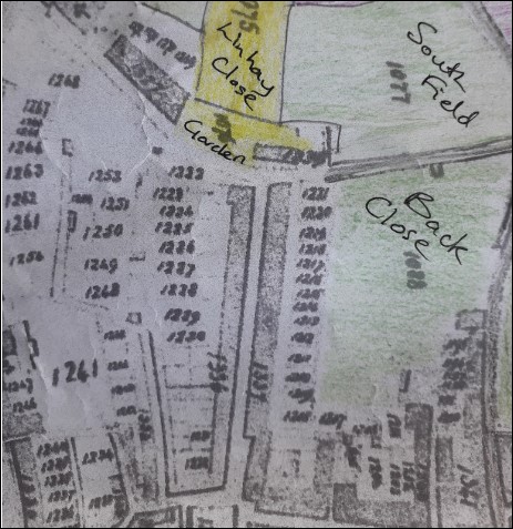 - Fig 9. Shows Rope Path Field at the top of Irsha Street, Appledore and the black line above the field name shows the rope path running along behind the cottages