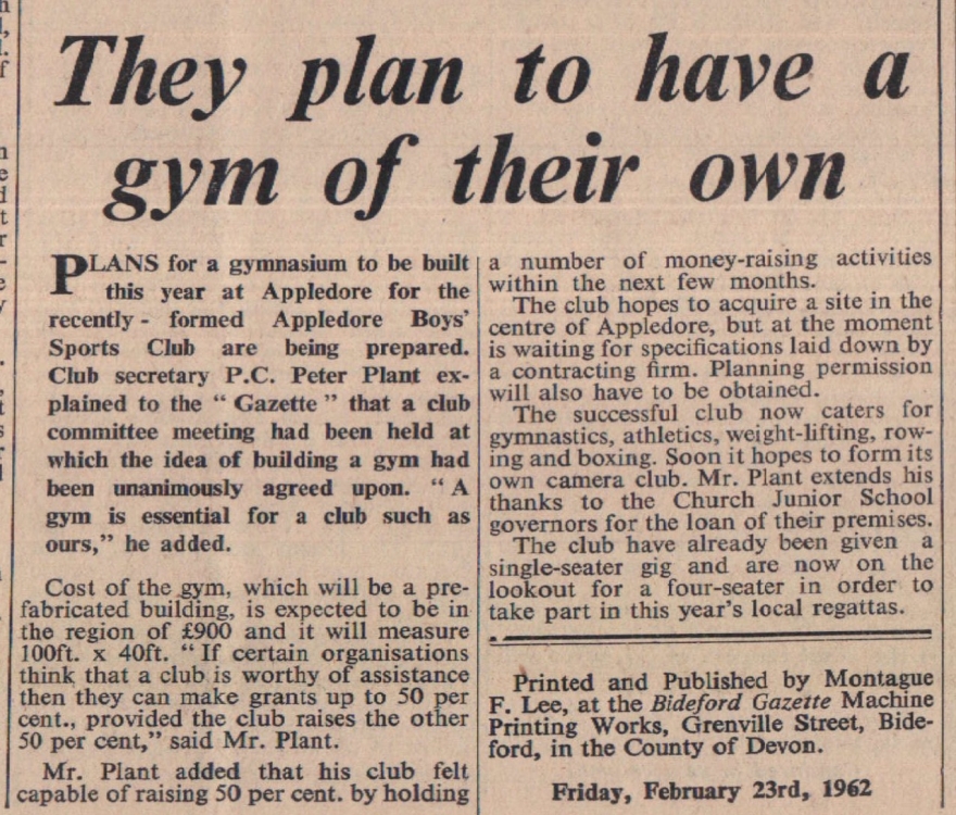 PC Peter Plant explained that there are plans for a gymnasium to be built at Appledore’s Boys’ Sports Club.