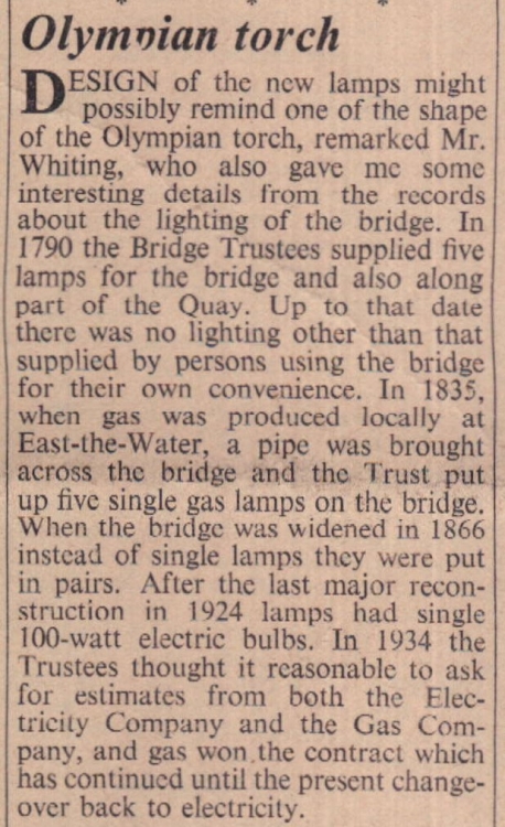 It is expected that the whole of the north side of Bideford Bridge will soon be electrically lit. The Bridge Warden, Mr Frank E Whiting, commenting on the many favourable reports he had received on the two new lamps that were put up in time for Christmas, said one person, however, had told him that he thought the design was too modern for such an ancient bridge. On this question of the lighting being in character with the bridge, one had to remember that the bridge is functional. That is its reason for existence and from time to time it has to be brought up to date to meet changing conditions. The design of the new lamps might be reminiscent of the Olympian torch.
