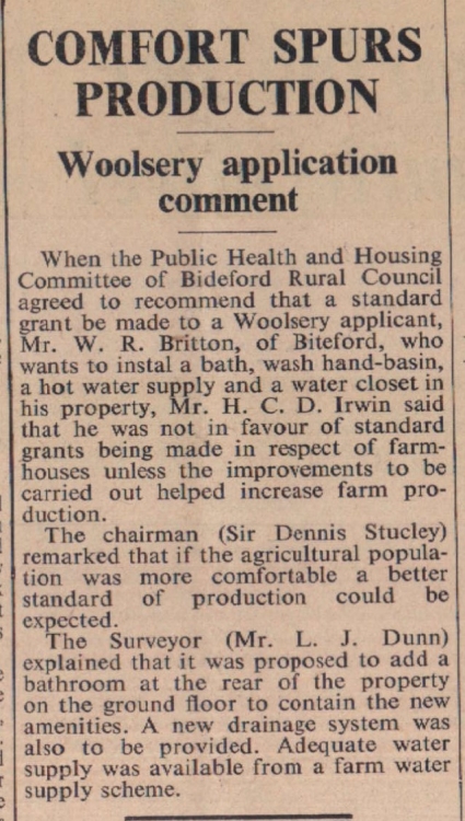 Bathrooms are to be provided for each of the eight flats at the almshouses of the Town and Alms Lands Charity, in New Street, Torrington. The Surveyor, Mr Peter Symons, of Town Council said the bathrooms could be assimilated in the quite large larder and kitchen space of each flat. The trustees would in due course be asking for improvement grants for the work. And mentioning bathrooms, Mr W R Britton of Biteford in Woolsery has a hard time getting a grant.