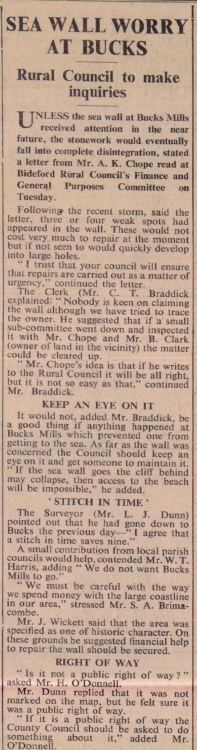 The sea wall at Bucks Mills is a worry, and it is unknown if it is a public right of way as it is not marked on the map.