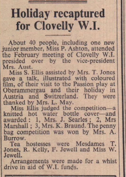 At Clovelly WI, Miss P Ashton joins as a junior member and Mrs Aust presides over the meeting.