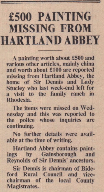 A painting worth about £500 and other articles are reported missing from Hartland Abbey which is the home Sir Dennis and Lady Stucley.