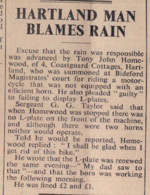 Tony John Homewood, of 4 Coastguard Cottages, Hartland was fined £2 and £1 for riding a motorcycle that was not equipped with an efficient horn. On duty at Goldworthy Cross, Parkham, PC Anderson noticed that a motorcyclist had no rear light on his machine. Clifford Robin Dark, of the Post Office, Abbotsham, pleaded guilty and was fined £3.