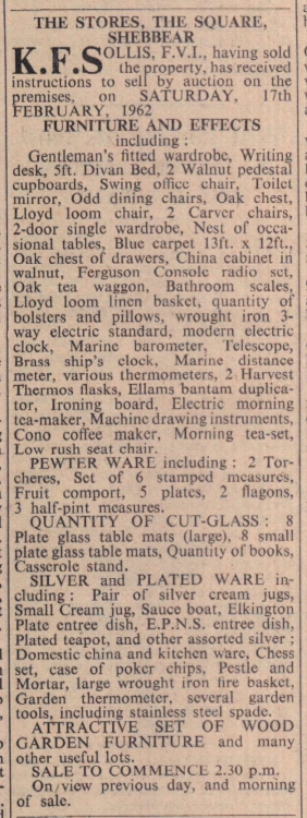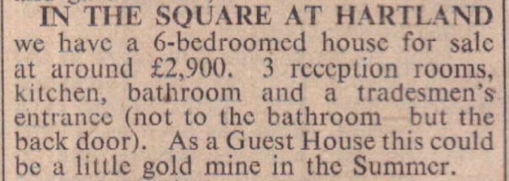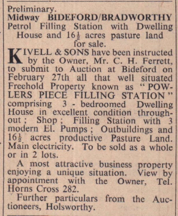 For sale – Powlers Piece Filling Station, dwelling house and pasture land for sale - midway between Bideford and Bradworthy. Furniture and effects from The Stores, The Square, Shebbear, are for sale, and a property in the Square at Hartland can be bought for around £2,900.