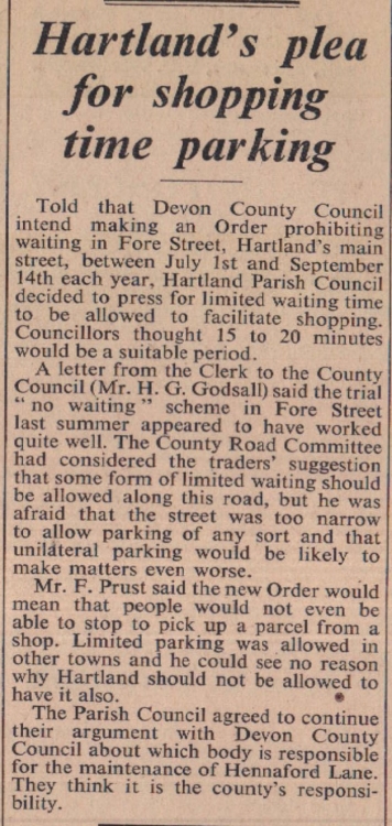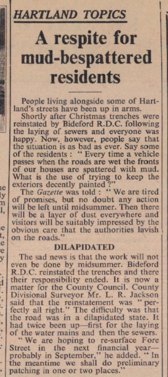 People living alongside some of Hartland’s streets have been up in arms about the state of their houses which keep getting spattered with mud. Later that week, workmen arrived and re-surfaced a length of the street in question and removed the more urgent source of complaint. Said one resident: ‘This temporary measure has eased the situation. We must give them full marks for doing something.’