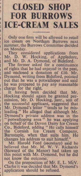 In response to the award of an ice-cream licence for Northam Burrows to Mr D Hocking jnr, Mr D A Dymond voiced his objection in a letter to the editor. ‘It would appear rather odd that Northam Burrows Committee first approved Mr Hocking’s application to sell ice cream and only after this decided to read applications from others. In answer to Mr D Hocking jnr, it is correct that I have connections with, in fact, four Bideford firms and would also add that as well as trading in ice cream in Westward Ho! I have relatives in various parts of the country. I would also remind Mr D Hocking jnr, son of the successful applicant, that the successful applicant sells ice cream on Bideford Quay rate free thanks to the assistance of Bideford Town Council. He also sells ice cream in Barnstaple, Torrington, etc.’