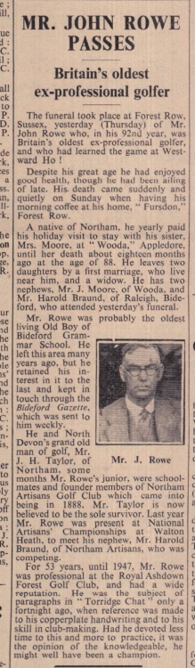 The death of Britain’s oldest ex-professional golfer, Mr John Rowe in his 92nd year, is announced. He was a native of Northam and used to stay with his sister, Mrs Moore, at Wooda in Appledore. He was school mates with Mr J H Taylor and was probably the oldest living Old Boy of Bideford Grammar School. Read more about Mr Rowe HERE