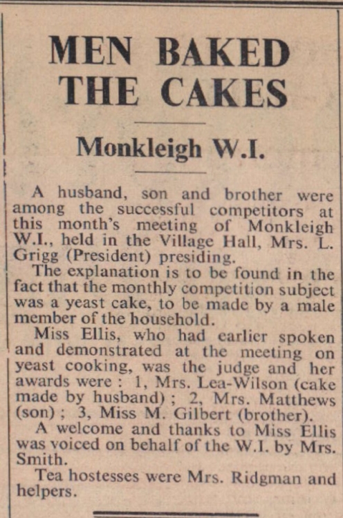 The men of Monkleigh were encouraged to bake for its WI meeting, presided over by Mrs Grigg. Miss Ellis demonstrated yeast cooking and judged the competition won by Mrs Lea-Wilson, Mrs Matthews and Miss Gilbert.