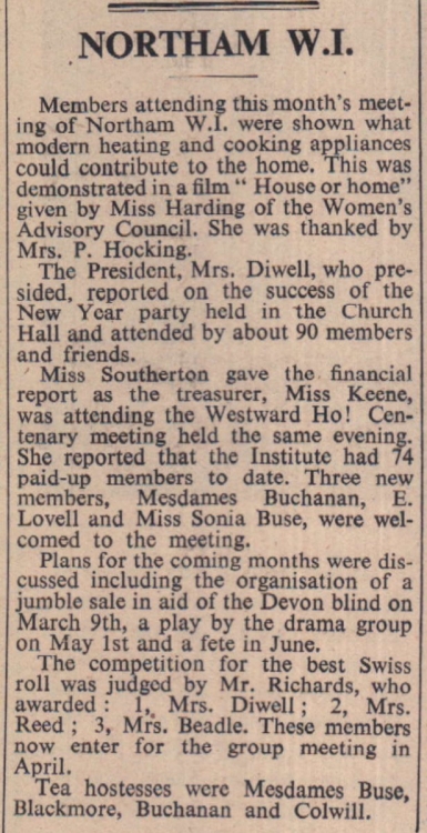 At Parkham WI, the meeting was presided over by Mrs Tucker and Mrs Hemmel have a talk illustrated by colour slides of her holiday in New Zealand. She was thanked by Mrs Dack. The competition – an article made from a face cloth – resulted: 1. Miss Margaret Hockin; 2. Mrs J Piper; 3. Mrs Crowe. Tea hostesses were Mesdames J Piper and C Rowe. At Northam WI, Mrs Diwell won the competition with Mrs Reed and Mrs Beadle as runners-up. Tea hostesses were Mesdames Buse, Blackmore, Buchanan and Colwill.