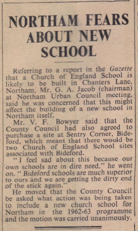 There is some concern that the building of a Church of England School in Chanters Lane, Northam and at Sentry Corner in Bideford might affect the building of a new school in Northam.