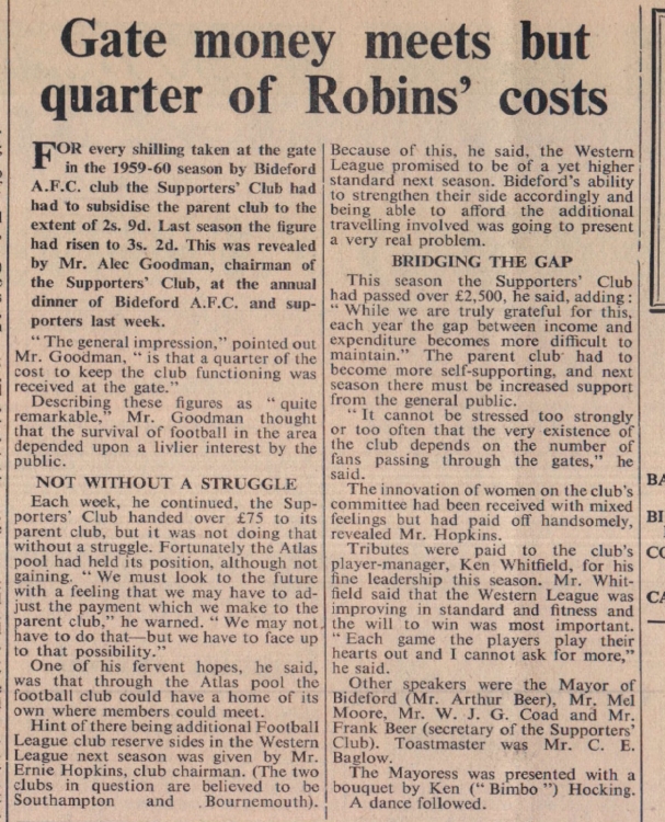 The gate money taken by Bideford AFC only meets but a quarter of Robins’ cost and is supported financially by the Supporters’ Club. At the annual meeting were members Mr Bill Finn, Gordon Harris, Graham Moore, Mike Harris, Jimmy Harris, Len Daniel, Billy Evans and Roy Drew.
