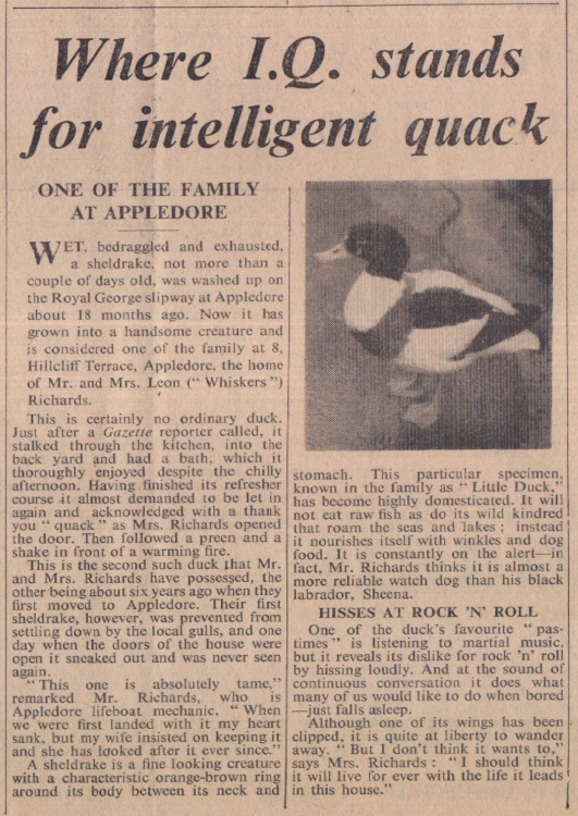 A fine looking sheldrake has taken up residence with Mr and Mrs Leon Richards at 8 Hillcliff Terrace, Appledore.