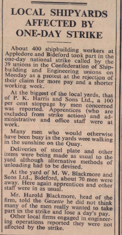 Shipyards P K Harris and Sons Ltd, and M W Blackmore and Sons Ltd were affected by a one-day national strike.