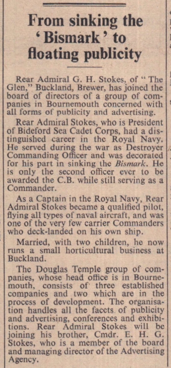 Rear Admiral G H Stokes of The Glen, Buckland Brewer, who is President of Bideford Sea Cadet Corps, has an additional job. He was decorated for his part in sinking the Bismark. The history of the Bismarck can be read HERE