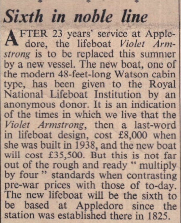 The lifeboat Violet Armstrong is to be replaced by a new vessel, a modern Watson cabin type, which has been given to the Royal National Lifeboat Institution by an anonymous donor. The new boat will be the sixth based at Appledore. Read about the 1959 rescue of the Polish vessel, Gliwice, by Violet Armstrong and the bravery of its crew - Coxswain Cann, William Cann, Leon Richards, Gordon Judd, Frederick Cane, Basil Marshall, Percival Eastman and Thomas Jewell HERE