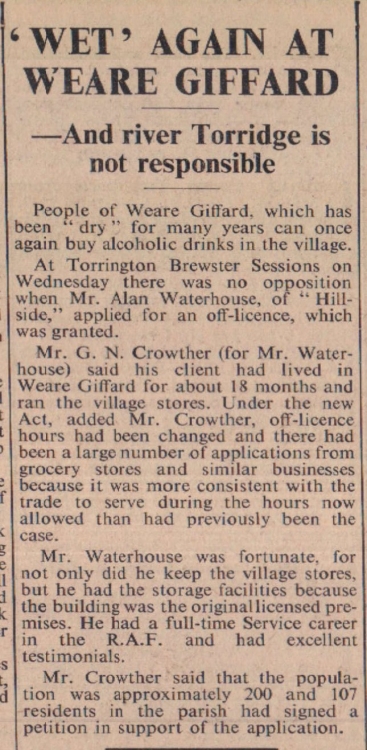 Alcoholic drinks can now be bought in Weare Giffard as there was no opposition when Mr Alan Waterhouse of Hillside applied for an off-licence.