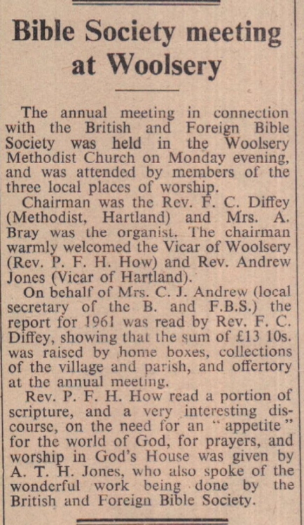 Rev F C Diffey chaired the annual meeting in connection with the British and Foreign Bible Society in Woolsery Methodist Church. Mrs Bray was the organist and Revs P F H How and Andrew Jones were warmly welcomed.