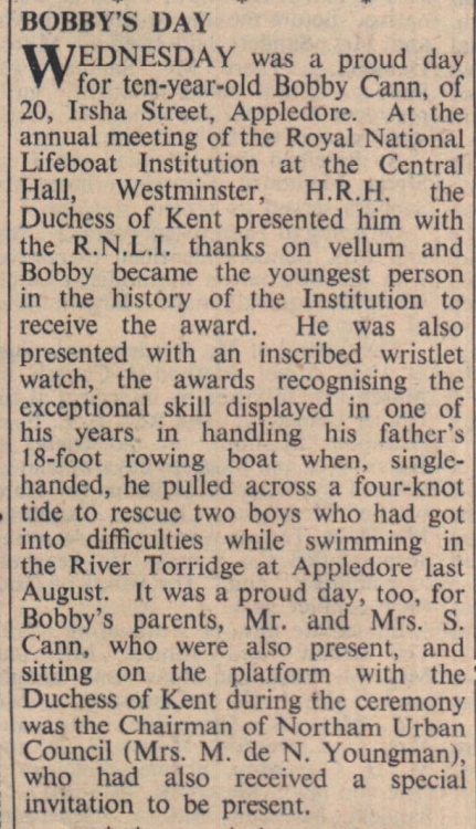 Bobby Cann, 20 Irsha Street, Appledore, receives an RNLI award from HRH the Duchess of Kent.