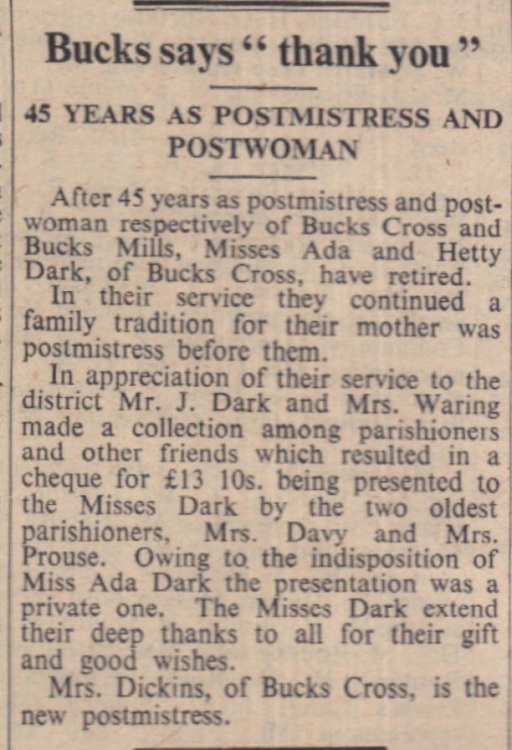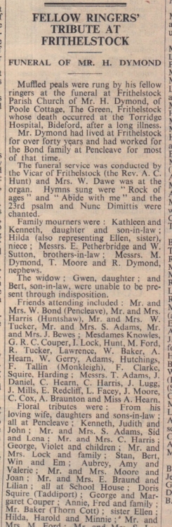 Muffled peals were rung at the funeral of Mr H Dymond, of Poole Cottage, The Green, Frithelstock. He had worked for the Bond family at Pencleave.