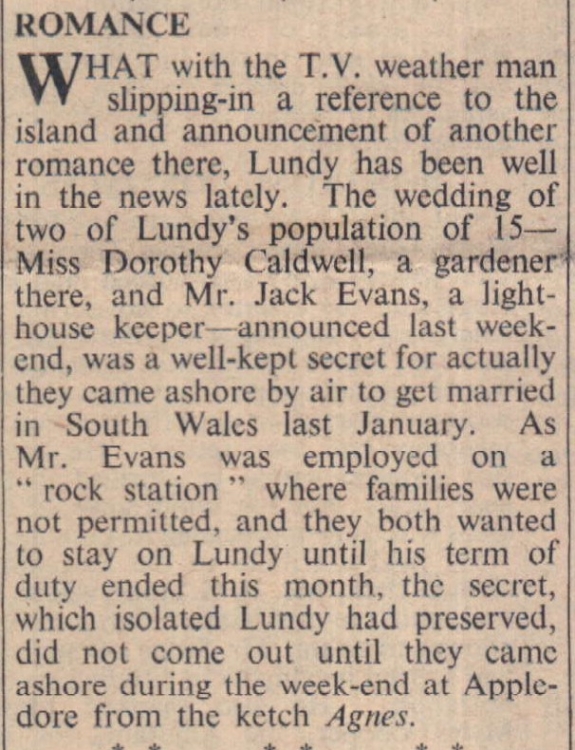 The secret is out! Two of Lundy’s population are married – Miss Dorothy Caldwell and Mr Jack Evans.
