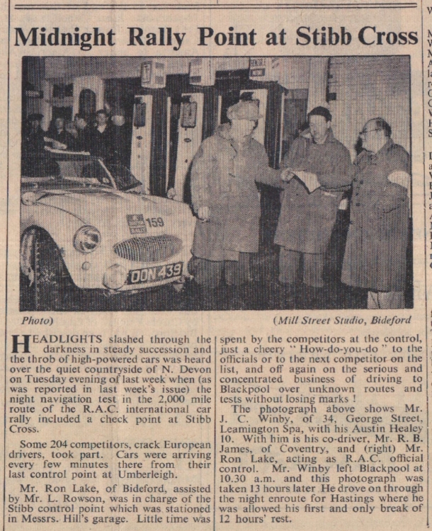 Mr Ron Lake, of Bideford, assisted by Mr L Rowson, helps with the RAC international car rally at a check point at Stibb Cross.