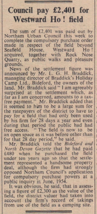 Northam Urban Council complete the compulsory purchase order for the field beyond Seafield House at Westward Ho!, together with Rock Nose Quarry. Mr L G H Braddick is agreeably surprised at the sum paid.
