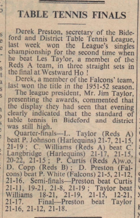 Table tennis finals won by Derek Preston against Les Taylor.