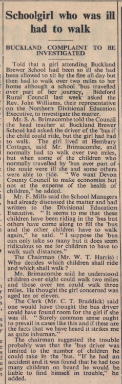 A girl attending Buckland Brewer School had to walk over two miles to her home at Hembury Cottages when the driver of the school ‘bus would not take her part of the way.