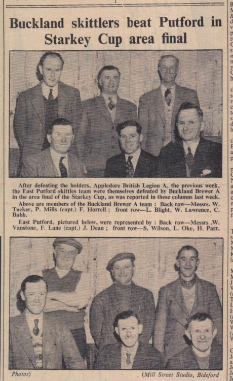 Buckland Brewer skittles team beat East Putford. In the picture are Messrs W Tucker, P Mills, F Horrell, L Blight, W Lawrence, C Babb, W Vanstone, F Lane, J Dean, S Wilson, L Oke, and H Parr.
