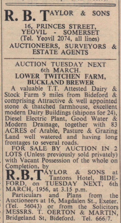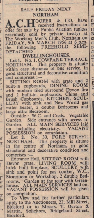 Properties for sale – 1 Cowpark Terrace; 30 Fore Street (both Northam); Moorhead at Woolsery (to view, contact Mr Jollans); Lower Twitchen Farm, Buckland Brewer