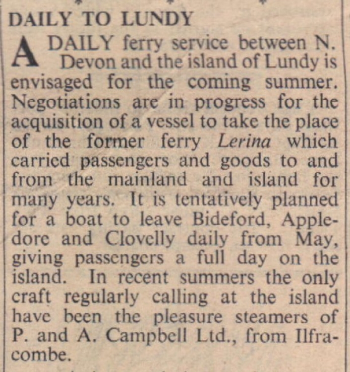 It is envisaged that a former ferry, Lerina, will no longer carry passengers and goods to and from the mainland and Lundy. A replacement is being sought.