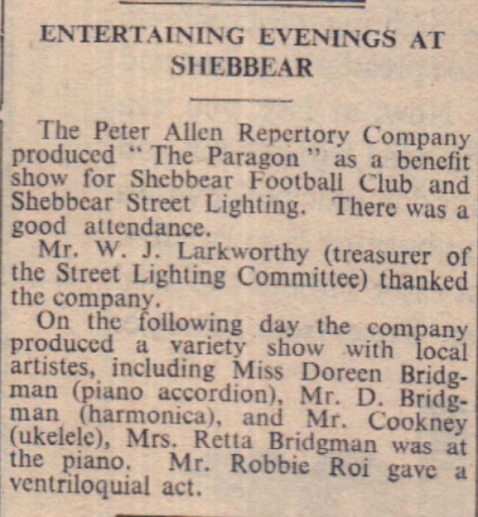 Mr W J Larkworthy thanked the Peter Allen Repertory Company which produced a benefit show for Shebbear Football Club and Shebbear Street Lighting.