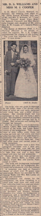 The wedding of Mr Williams and Miss Cooper took place at St Mary’s Church, Bideford, officiated by Preb J A Durling and accompanied by Mr Trigger. The bride was attended by Misses Cherry Beer and Linda Baker, with the duties of best man carried out by Mr Dennis Bahn, and as ushers, Frank Beer and Charles Piper. Music at the reception, held at Tanton’s Hotel, was provided by Mr George Weeks and Mrs Bob Lamey.