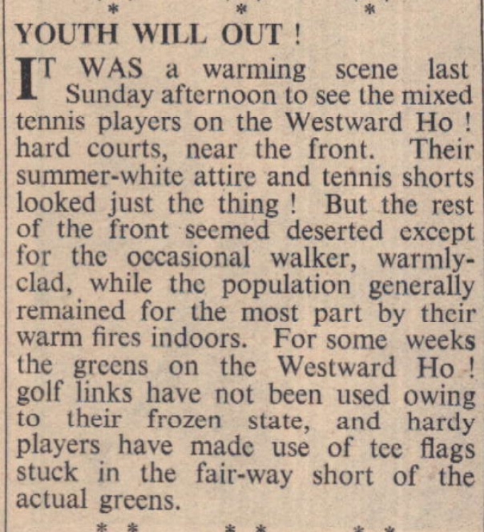 Mr J H Taylor, Northam’s ‘grand old man’ of golf, five times open champion, was visited by cameramen of commercial TV who took a number of scenes at his home at Windmill Lane, Northam – from which can be seen Northam Burrows where he learnt his golf – and at the Royal North Devon Golf Club at Westward Ho! Although the film, which was televised on Tuesday evening, undoubtedly gave pleasure to his countless friends in golf in many other parts of the country, this could not be shared locally as it is not possible to receive ITV programmes in N. Devon yet, although there are reports that the sound of such programmes has been picked up from time to time. Wearing a thick overcoat to protect him from the bitter weather, Mr Taylor, who will be 85 on March 19th, was filmed putting on the club’s 18th green. Then he visited the club-house and was filmed with Mr Granville Kelly, the steward, who is retiring after Easter week after 51 years’ association with the club. His son, Mr Sidney Kelly, will succeed him as steward, thus continuing a family association with the club which began in 1864.