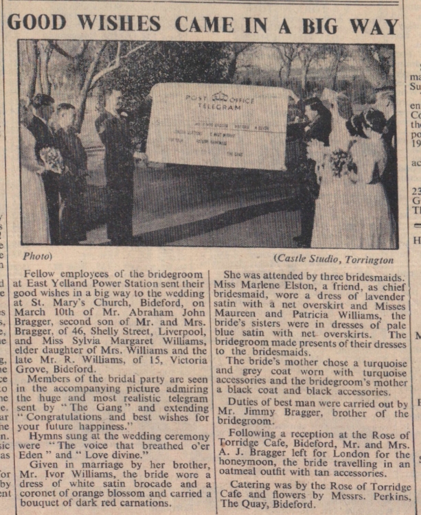 Mr Abraham John Bragger and Miss Sylvia Margaret Williams are sent good wishes by their fellow employees at East Yelland Power Station. Bridesmaids were Miss Marlene Elston and Misses Maureen and Patricia Williams, with the best man, Mr Jimmy Bragger. The reception was held at the Rose of Torridge Café, Bideford, and the couple went to London for their honeymoon.
