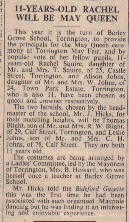 Rachel Squire, daughter of Mr and Mrs T Squire, of 25 Castle Street, Torrington, and Alison Johns, daughter of Mr and Mrs W Johns, of 24 Town Park Estate, have been chosen as queen and crowner for the May Queen ceremony. Thomas Blight and Leslie Johns will be heralds.