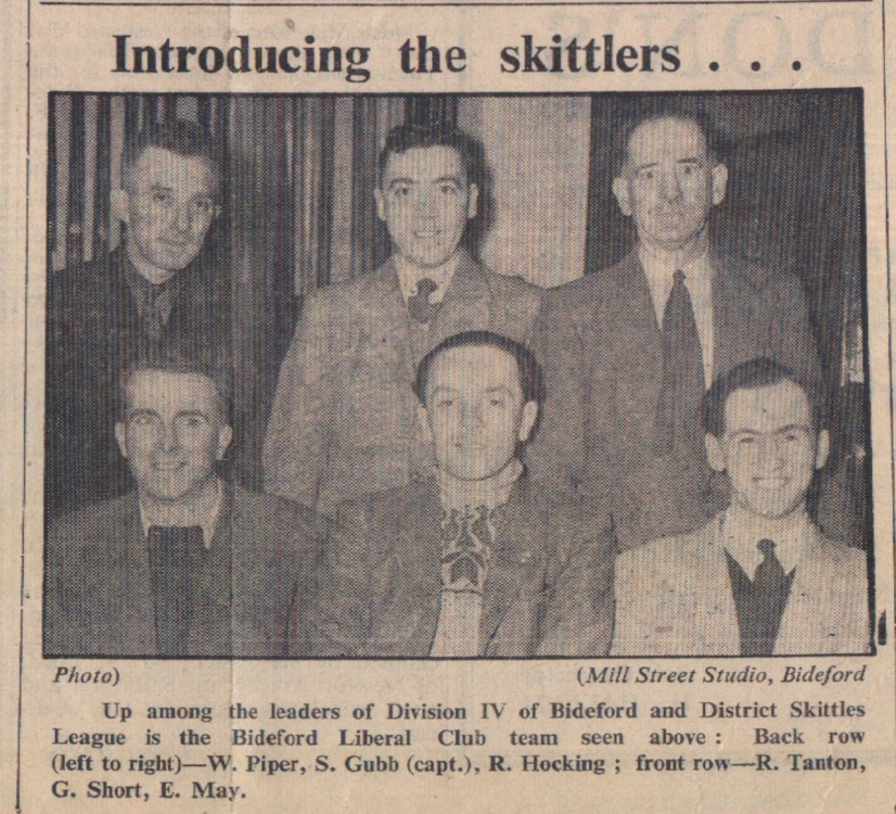 Up among the leaders of Division IV of Bideford and District Skittles League is the Bideford Liberal Club team: W Piper, S Gubb, R Hocking, R Tanton, G Short, E May.