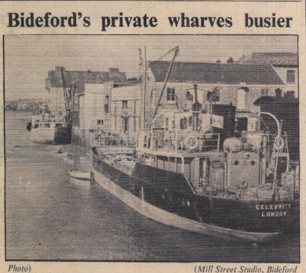 Bideford’s private wharves were at their busiest since the war on Tuesday when this picture was taken. The latest to be deepened for coastal vessels is that of Messrs I Baker and Sons Ltd, in the foreground, where m.v Celebrity is discharging cement. At the Devon Trading Co Ltd, in background, the m.v Stan Woolaway is discharging gravel. If need be, Bideford, including its municipal quays, can now accommodate five vessels of aggregate tonnage of 3,500 at the same time. Bideford (including private docks) handles sea-cargoes averaging 2,000 tons weekly.