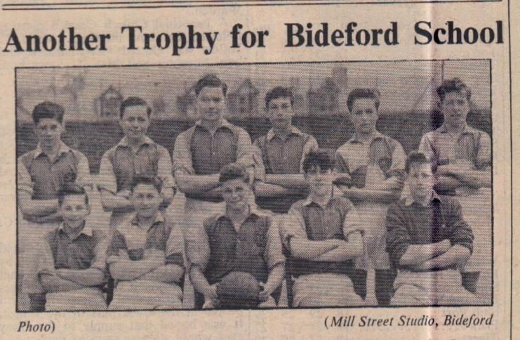 Bideford Secondary Modern School beat Braunton Secondary Modern School 3-2 in the final of the Houldsworth Cup. In the final, Bideford opened the scoring through a drive by Cook, but Brooke levelled the scores with a hooked shot. Bideford regained the lead through E Davis. This lead was increased when Cook banged in his second. Braunton then threw everything into a last ditch effort and their strivings were rewarded when Fitzpatrick scored. An equaliser seemed possible but the Bideford defence held out. The team: Leonard Harris, Andrew Davies, Thomas Ford, Kenneth Downing, Victor Philip, John Davies, Thomas Cook, Brian Slade, Michael Powe, Gordon Harris, Brian Staddon.
