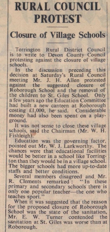 Village schools recommended for closure include: Alwington; Littleham and Landcross; Little Torrington, and Roborough. Torrington Rural District Council is to write to Devon County Council against the closure of village schools.
